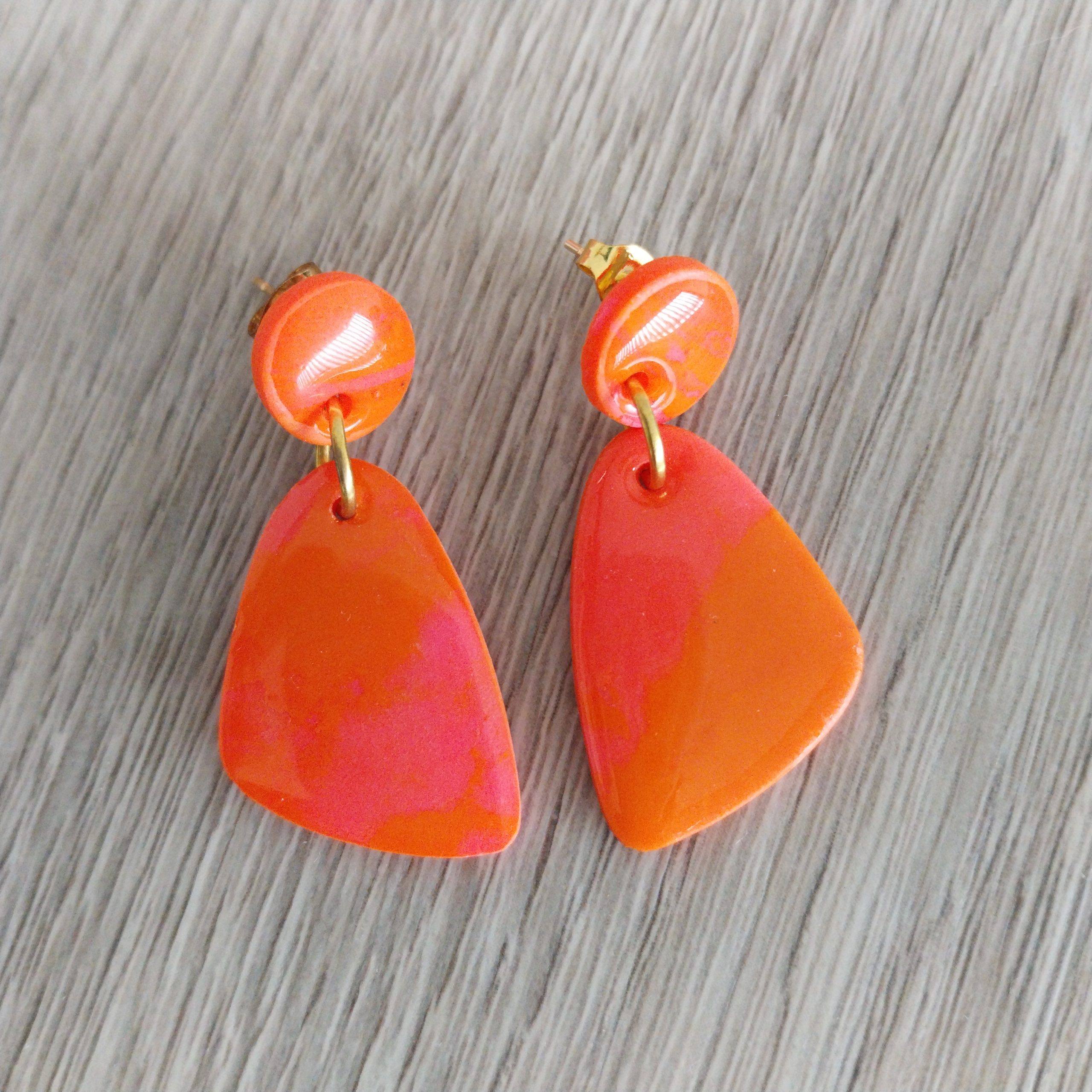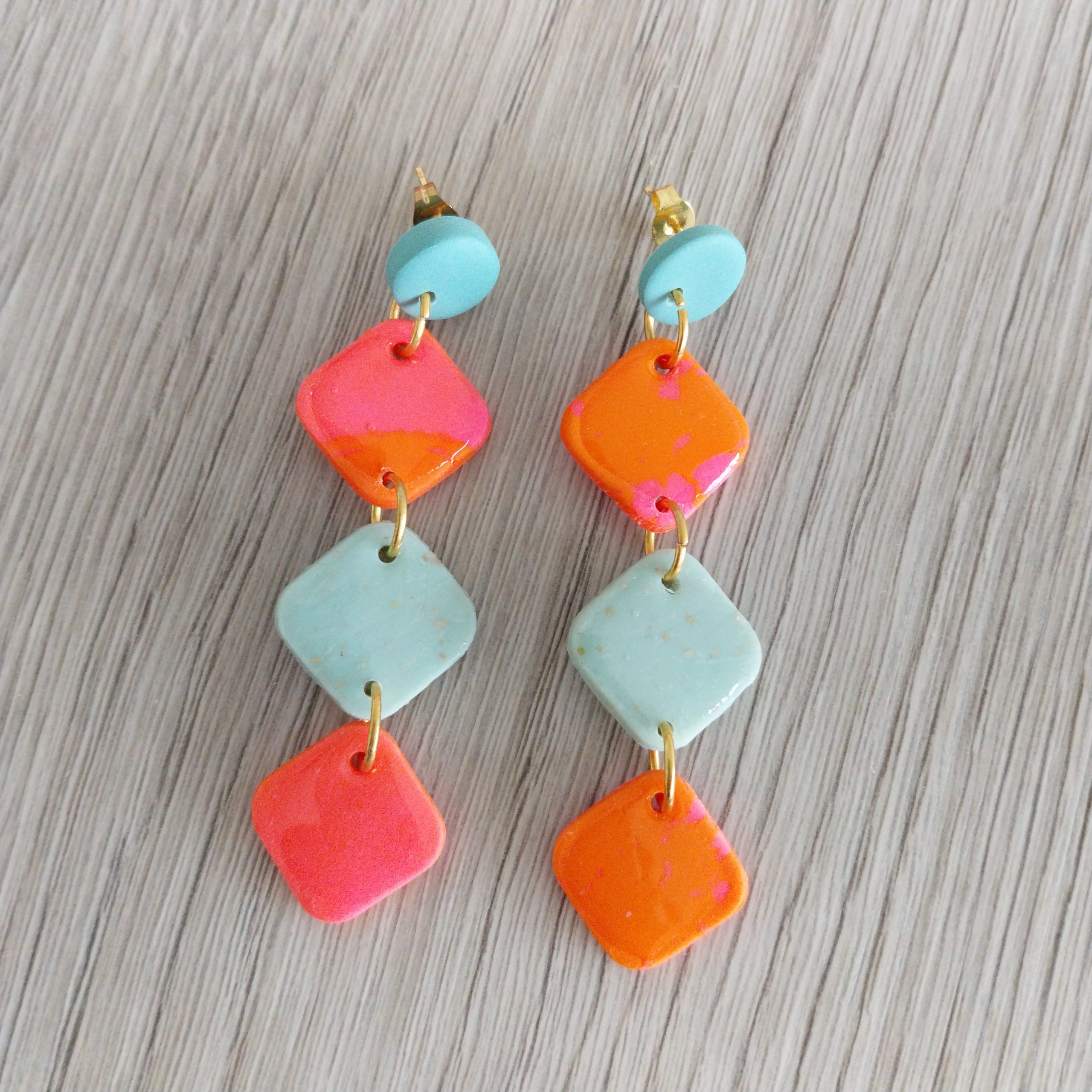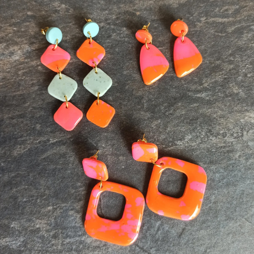 Cada par de brincos é uma fusão de tons tropicais – coral, laranja, rosa e menta – que celebram a alegria e originalidade de quem adora peças únicas e feitas à mão.