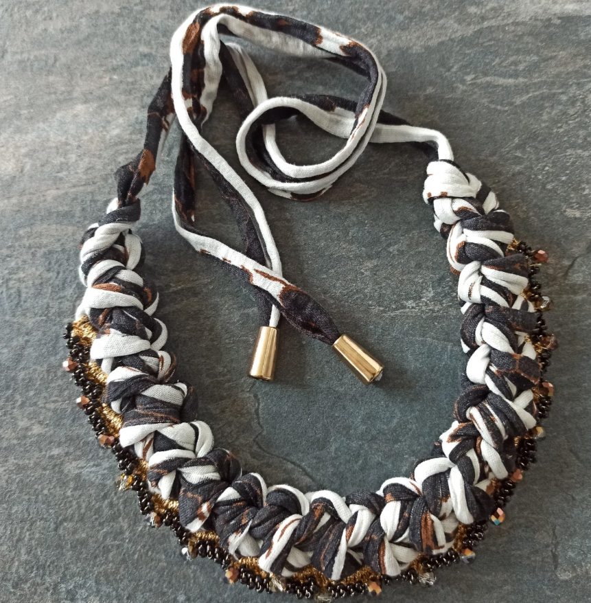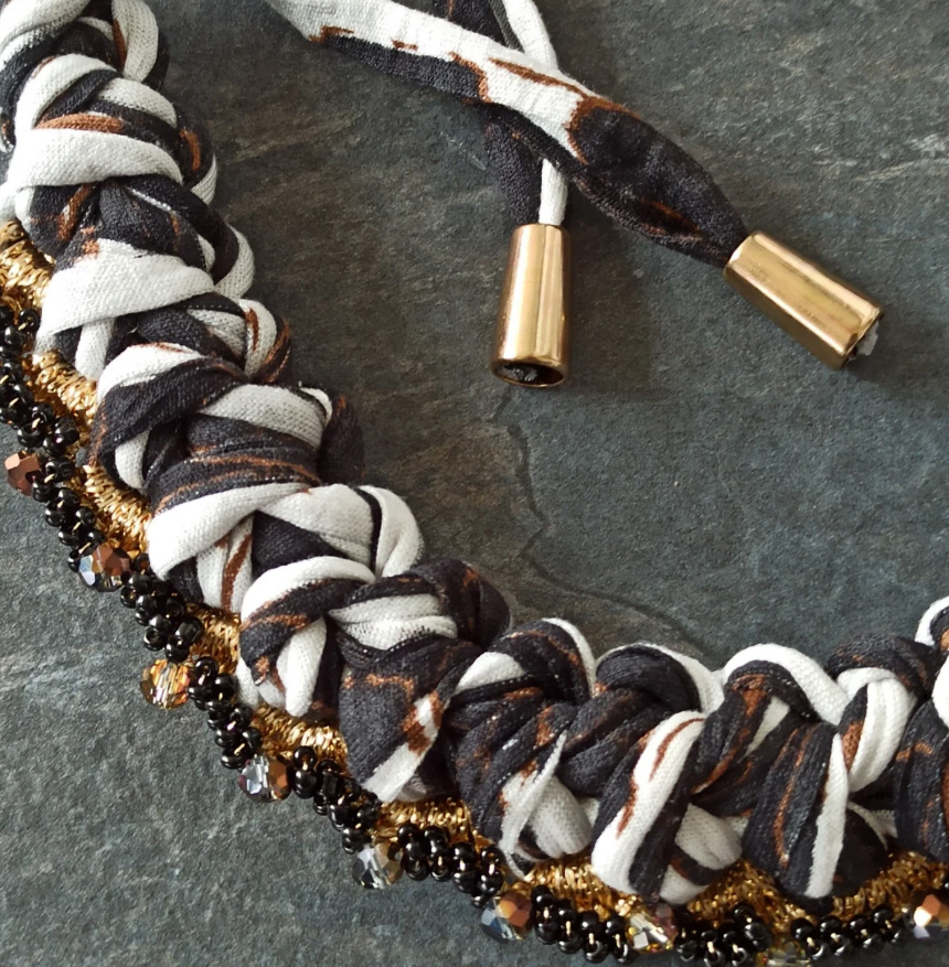Numa versão animal print o que o torna mais sofisticado. Feito à mão com tons de preto, branco e dourado. Uma peça elegante e contemporânea, perfeita para destacar qualquer look com um toque de brilho discreto e originalidade.